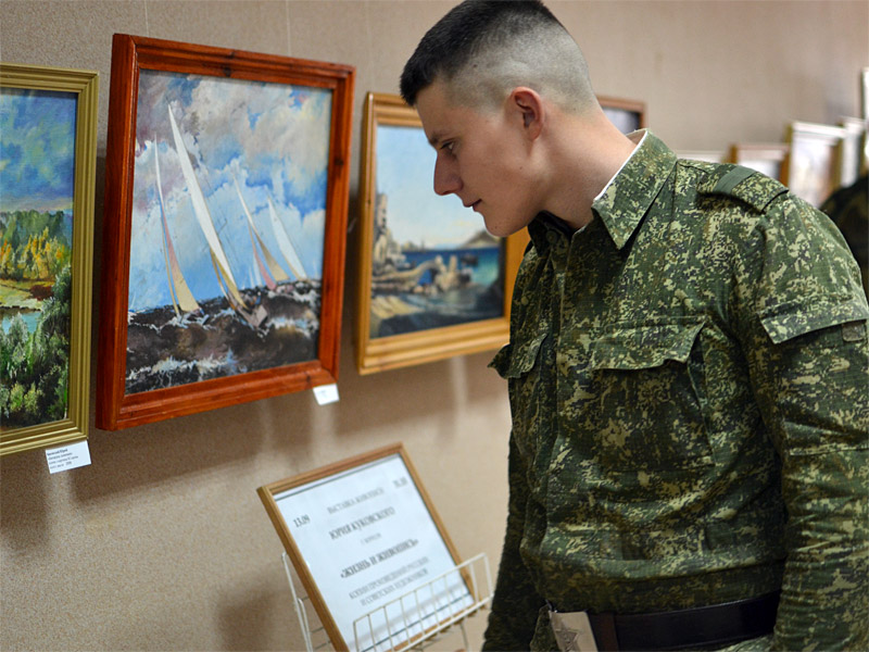 Для воинов была также организована экскурсия на выставку работ самодеятельного художника, полковника в отставке Юрия Куковского, размещенной на втором этаже библиотеки. Художник рассказал о себе, о своей службе в войсках ПВО, о своем пути в искусство. Ряд работ Ю. Куковского написан на библейскую тематику.
