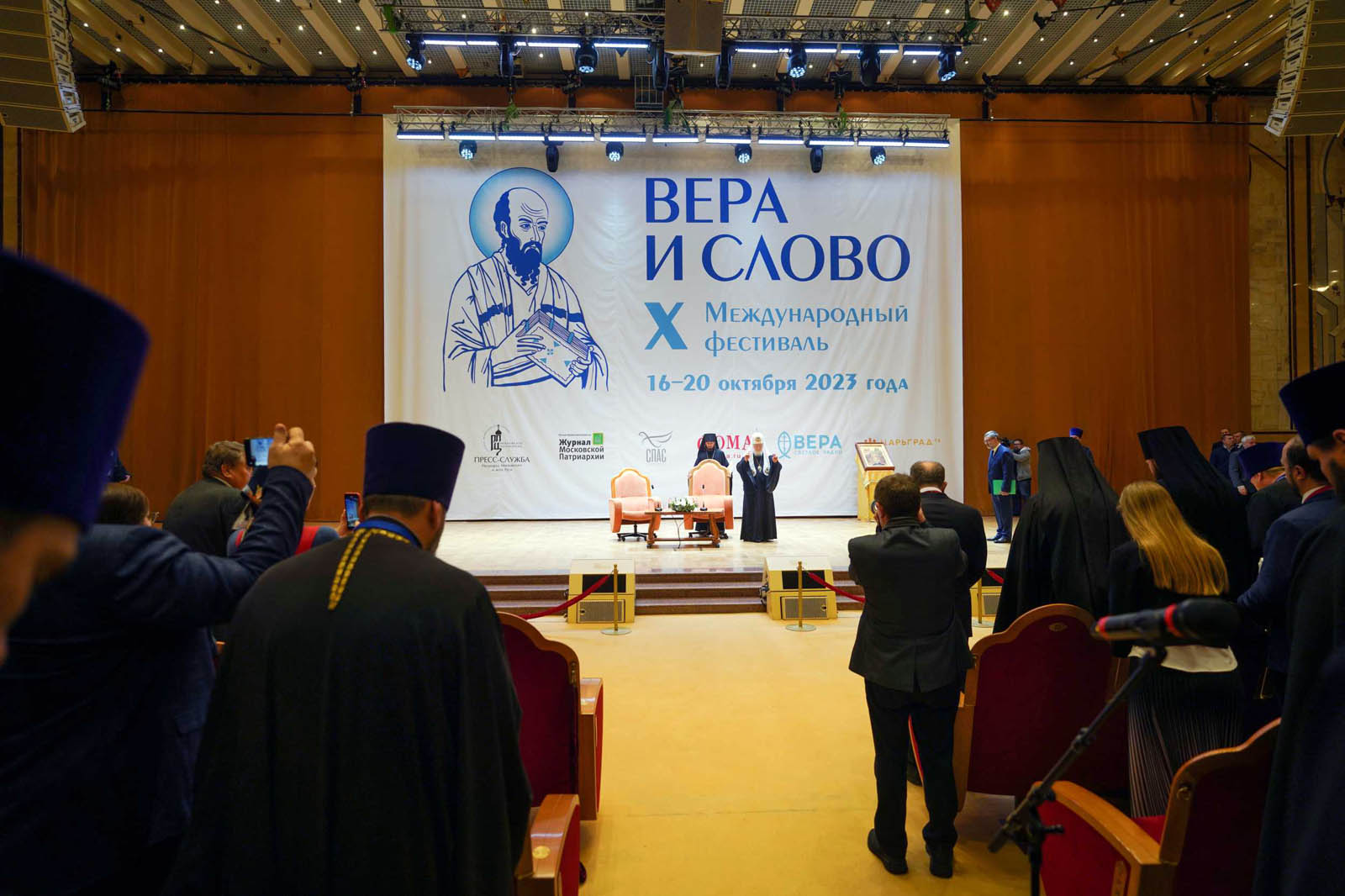 «Мы сердечно Вас приветствуем на юбилейном X фестивале «Вера и слово», международном фестивале, проходящем по Вашему благословению. Ваше Святейшество, у нас в зале примерно 500 человек из 200 епархий Русской Православной Церкви, 9 стран пастырской ответственности Русской Православной Церкви, а также наши гости — представители светских СМИ, органов государственной власти, общественных организаций — и все с надеждой, радостью и волнением ждут Вашего слова», — сказал В.Р. Легойда.