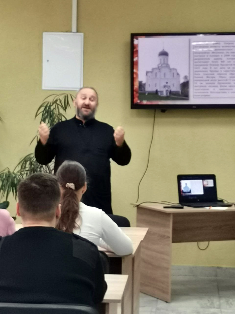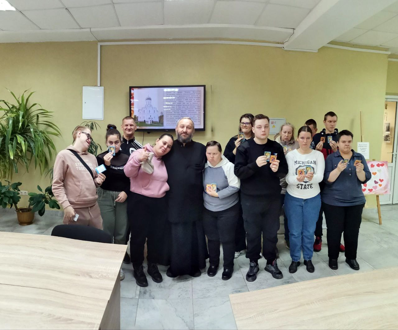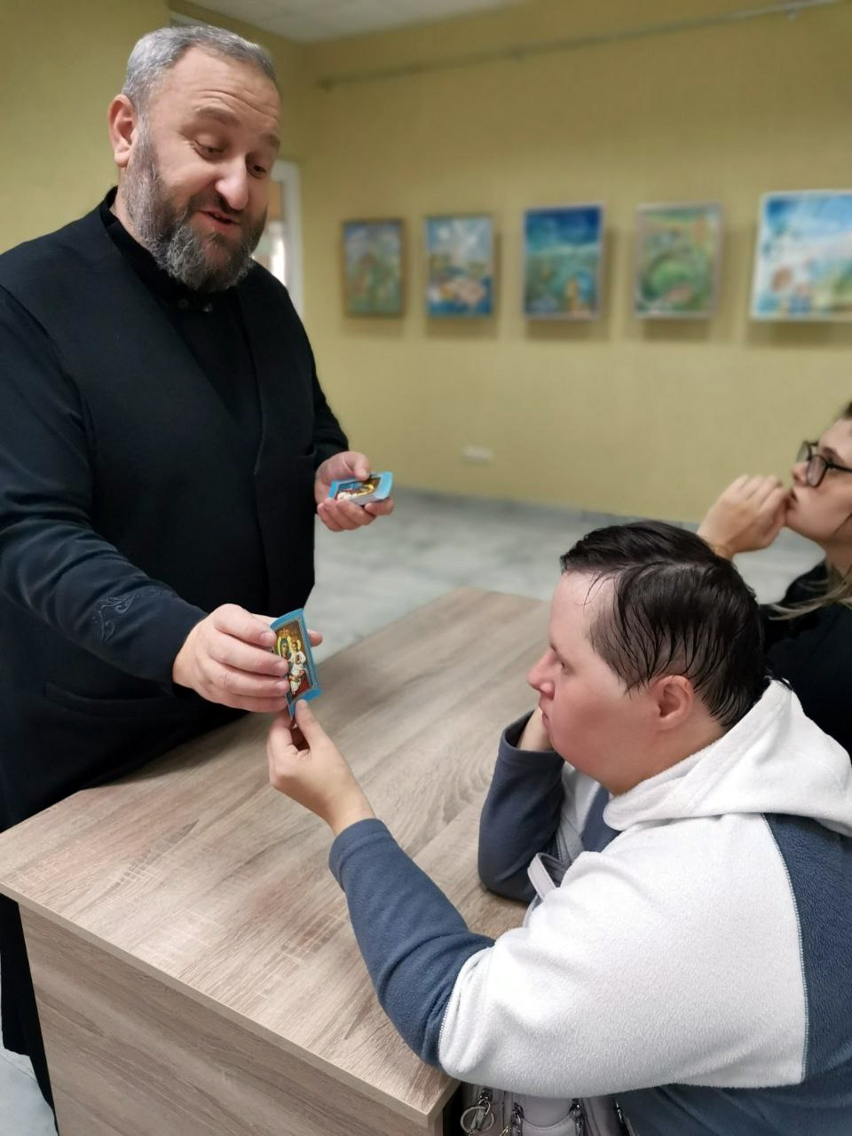 В рамках Недели родительской любви, совместно с отделом духовно-просветительской работы Центральной библиотеки, отделения дневного пребывания молодых инвалидов территориального центра социального обслуживания населения, Борисовской епархией, настоятель прихода святого великомученика Георгия Победоносца протоиерей Иоанн Миронович провел беседу с ребятами, рассказал им о празднике Покрова Пресвятой Богородицы, о Днях матери и отца, подарил им иконки.