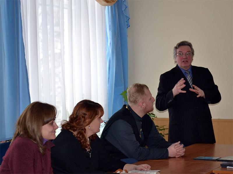Перед директорами школ выступил отец Сергий. Он кратко рассказал об основах христианского вероучения, о взаимодействии школ и церкви, о работе отдела образования и катехизации Борисовского благочиния и приходской Воскресной школе, о предстоящих рождественских мероприятиях.