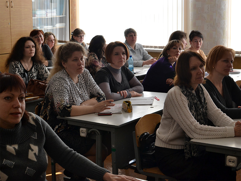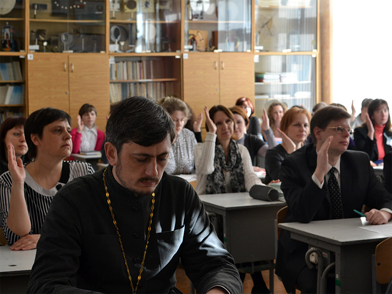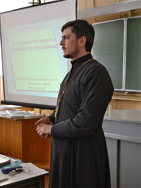 После доклада заместителя директора по воспитательной работе Т.И. Вороны, в котором она рассказала о состоянии и направлениях нравственного воспитания в школе, перед педагогами выступил отец Александр. Он акцентировал их внимание на сотрудничестве Церкви и учреждений образования.