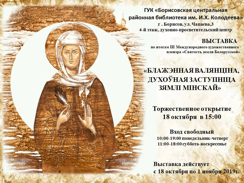 В ГУК «Борисовская центральная районная библиотека имени И.Х. Колодеева» проходит выставка «Блажэнная Валянціна, духоўная заступніца зямлі Мінскай».