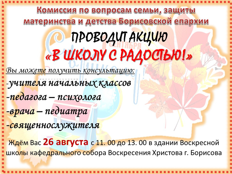 Комиссия по материнству и семье Борисовской епархии проводит акцию "В ШКОЛУ С РАДОСТЬЮ!" Вы можете получить консультацию: