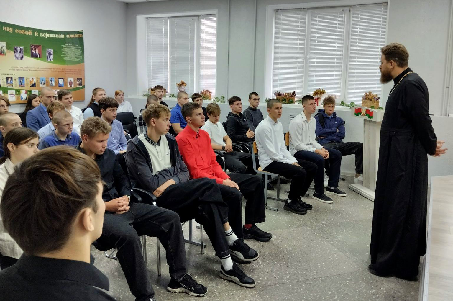 22 октября руководитель епархиального отдела по вопросам семьи, настоятель храма иконы Божией Матери «Всех скорбящих Радость» деревни Гора Борисовского городского округа иерей Антоний Семилет посетил Борисовский филиал учреждения образования «Плещеницкое государственное областное училище олимпийского резерва», где встретился со старшеклассниками.