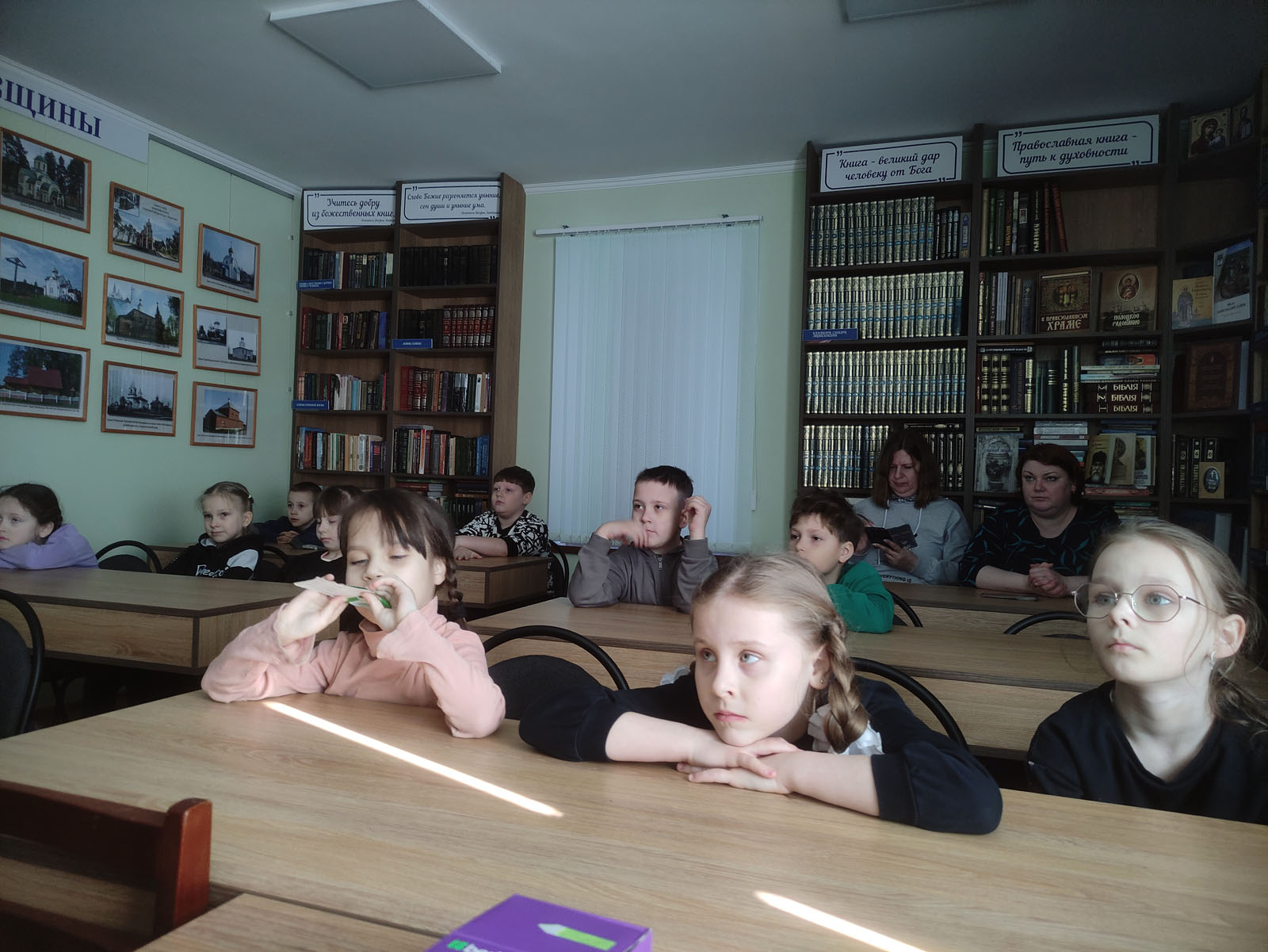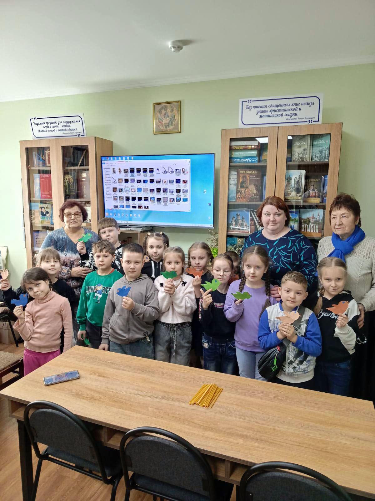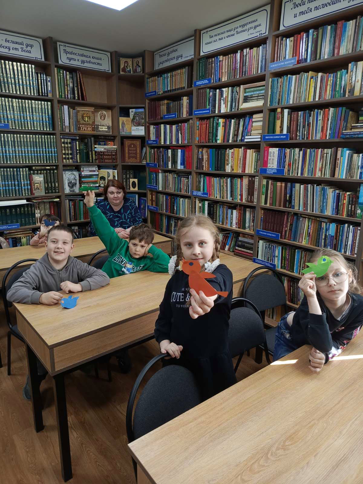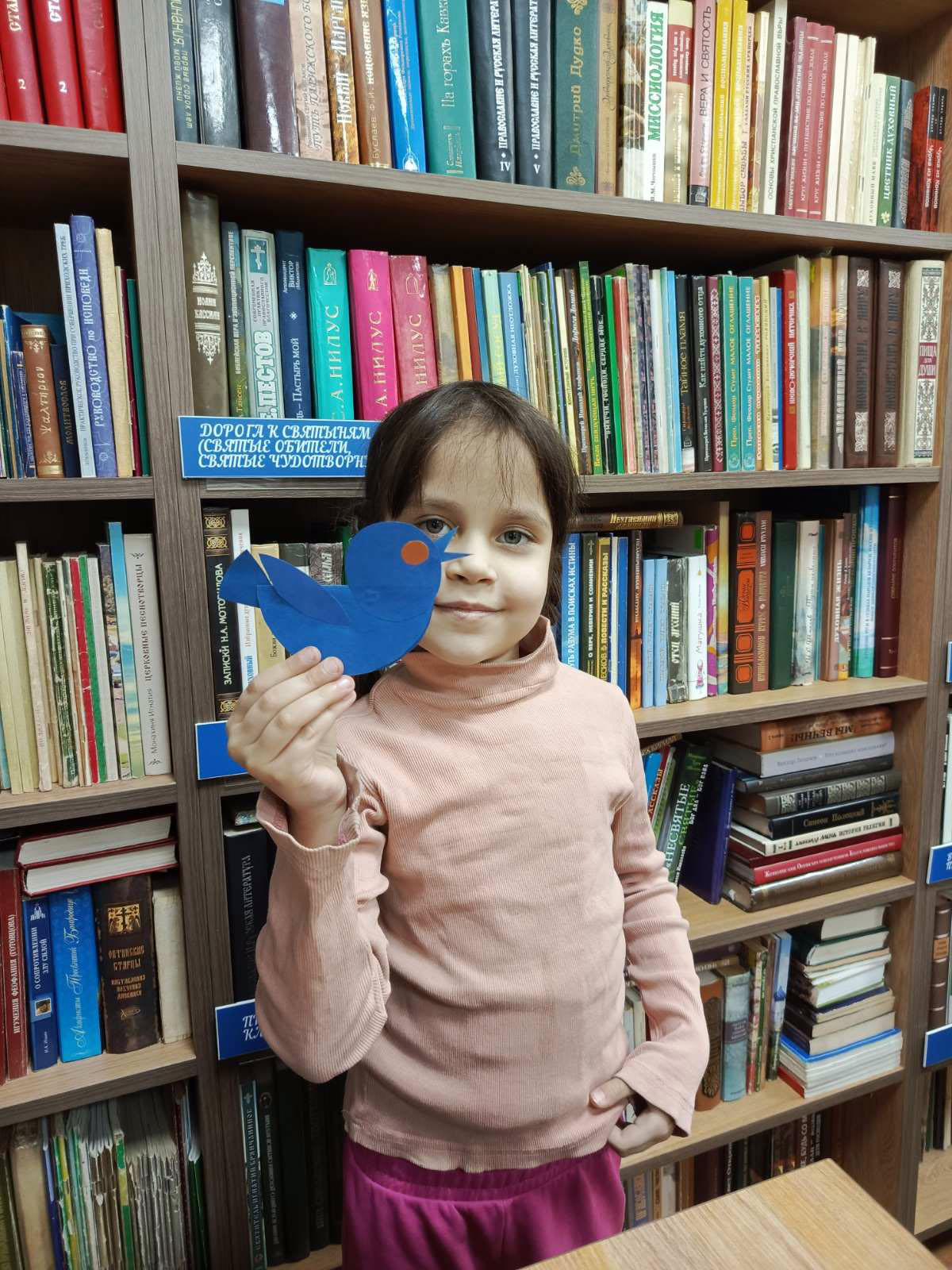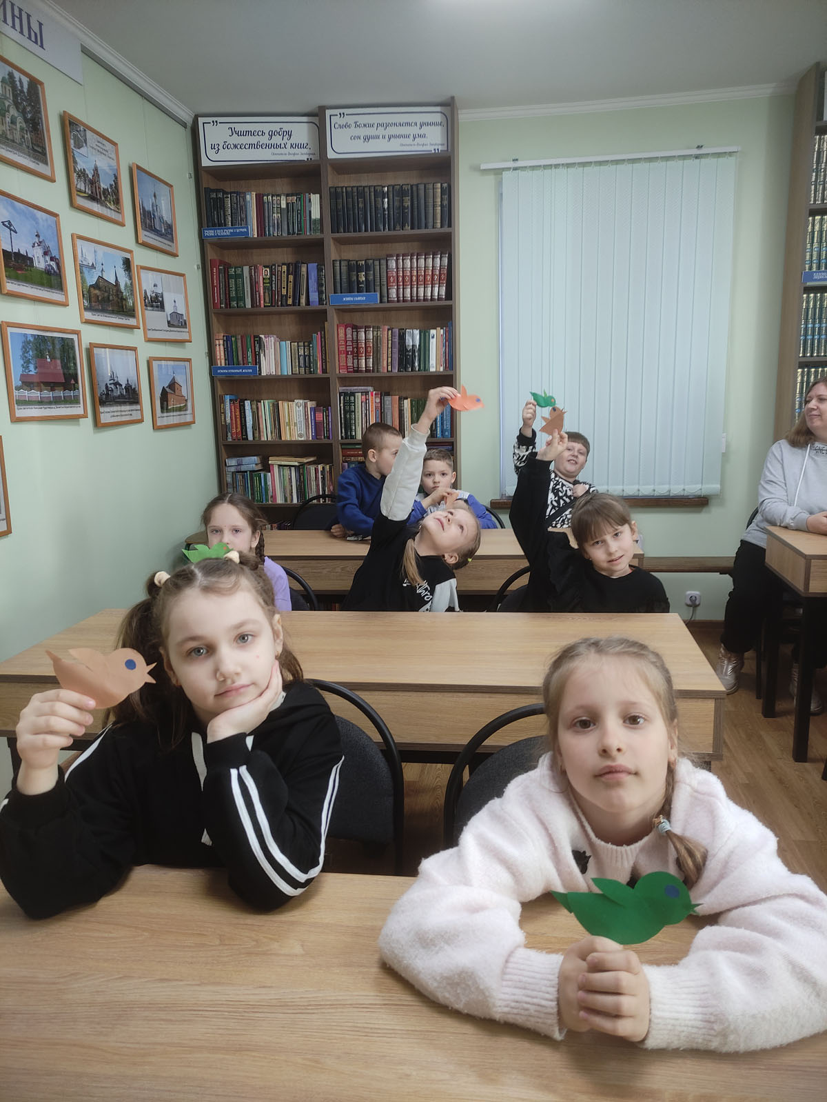 Ребятам был представлен рассказ о православной книге, сопровождавшийся показом иллюстраций и объяснением их содержания. Особое внимание уделили весенним православным праздникам – Благовещению и Пасхе. Дети с интересом посмотрели православный мультфильм «Птичка», посвященный Благовещению, а затем сами изготовили бумажных жаворонков.