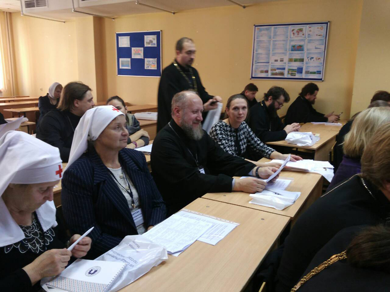 И ещё много других интересных проектов. Вечером 17 октября участники съезда встретились с председателем Синодального отдела по церковной благотворительности и социальному служению епископом Орехово-Зуевским Пантелеимоном. Встреча прошла в формате «вопрос-ответ». Вопросы участников касались духовной и организационной работы в социальном служении: как избежать «выгорания», как наладить работу с подчинёнными, с добровольцами. Многие вопросы касались особенностей взаимодействия церковных и государственных социальных структур, различий в организации работы социальных отделов в России и за рубежом. В середине встречи участники соборно помолились о здравии пострадавших и упокоении погибших в трагедии в Керчи. Также все собравшиеся помолились о скорейшем выздоровлении участников съезда из Североморской епархии, которые по дороге в аэропорт попали в дорожную аварию. 19 октября пленарное заседание съезда в Храме Христа Спасителя возглавил Святейший Патриарх Московский и всея Руси Кирилл. Была отслужена Панихида о невинно убиенных в г. Керчи. Святейший Патриарх пожелал сил родителям невинно убиенных и отметил о необходимости оказания помощи всем кто связан с этим событием. Сделать всё что нужно, чтобы поддержать родителей. Далее Святейший Патриарх сказал слова благодарности социальным работникам, сестрам милосердия за ту работу, что они выполняют и обратил внимание на качество оказываемой помощи, указал на необходимость обучения сестёр милосердия.