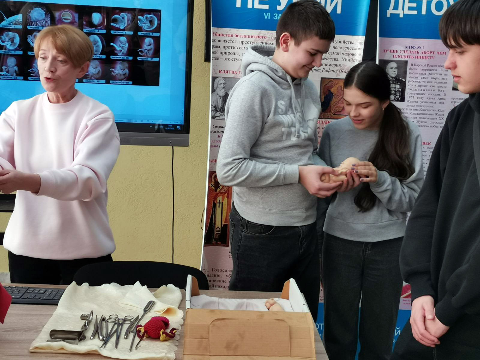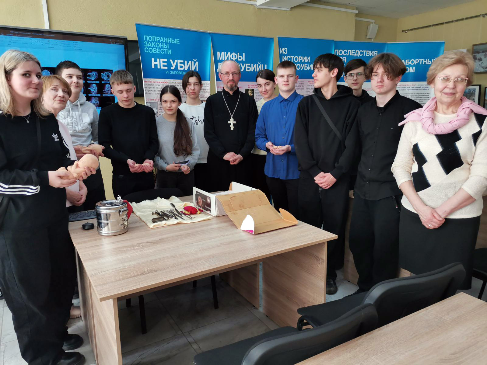 Беседа состоялась при участии иерея Сергия Хацкевича, настоятеля прихода храма святого великомученика Димитрия Солунского аг. Старо-Борисов, библиотекаря отдела просветительской работы Хацкевич Жанны Александровны, сотрудников УЗ «Борисовский родильный дом», врача-акушера-гинеколога Тамашевич Татьяны Олеговны и психолога Русановой Екатерины Дмитриевны.