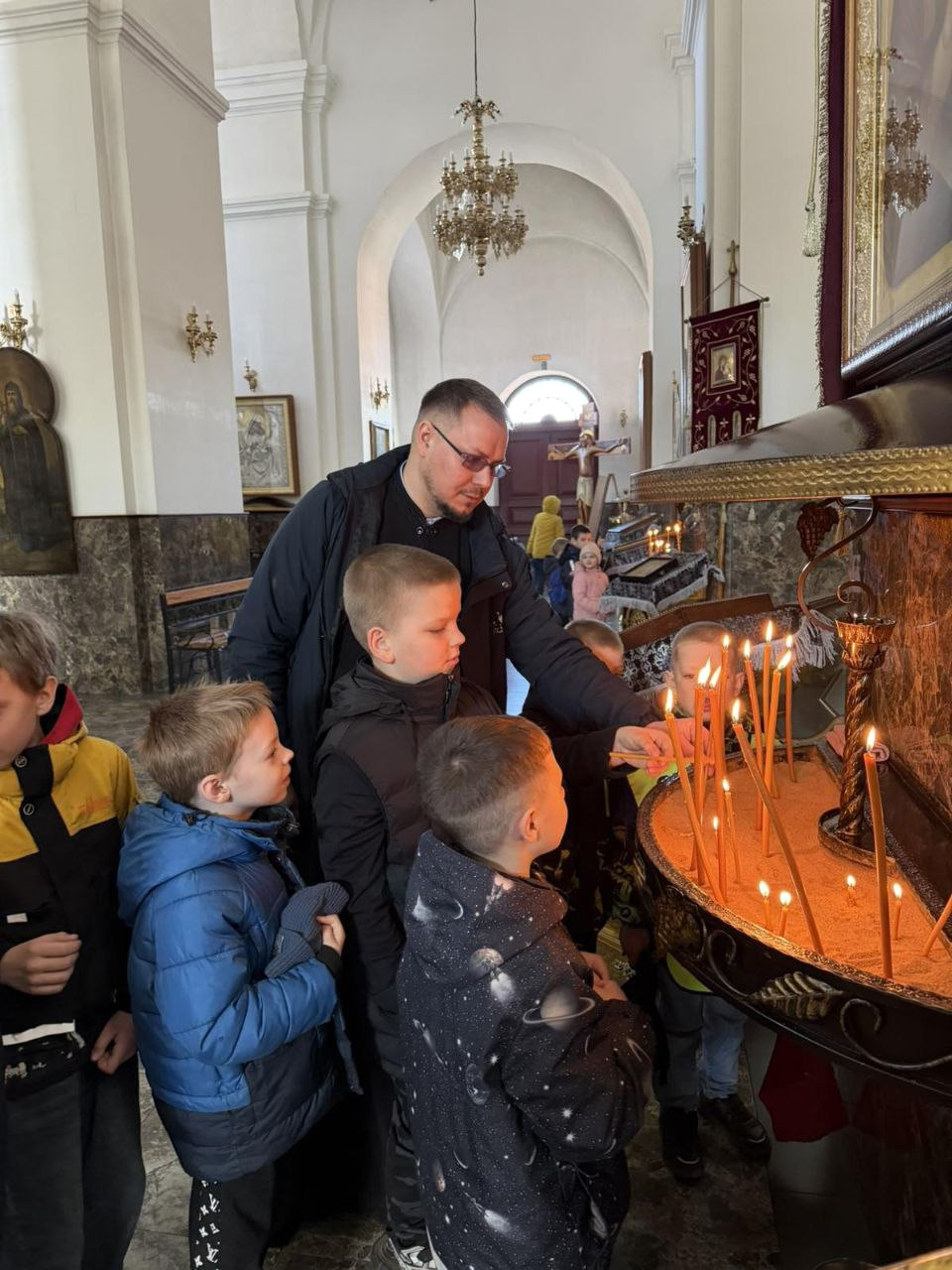 Отец Владимир рассказал ребятам об устройстве храма, показал богослужебные книги. Ребята вместе со священнослужителем поставили свечи.