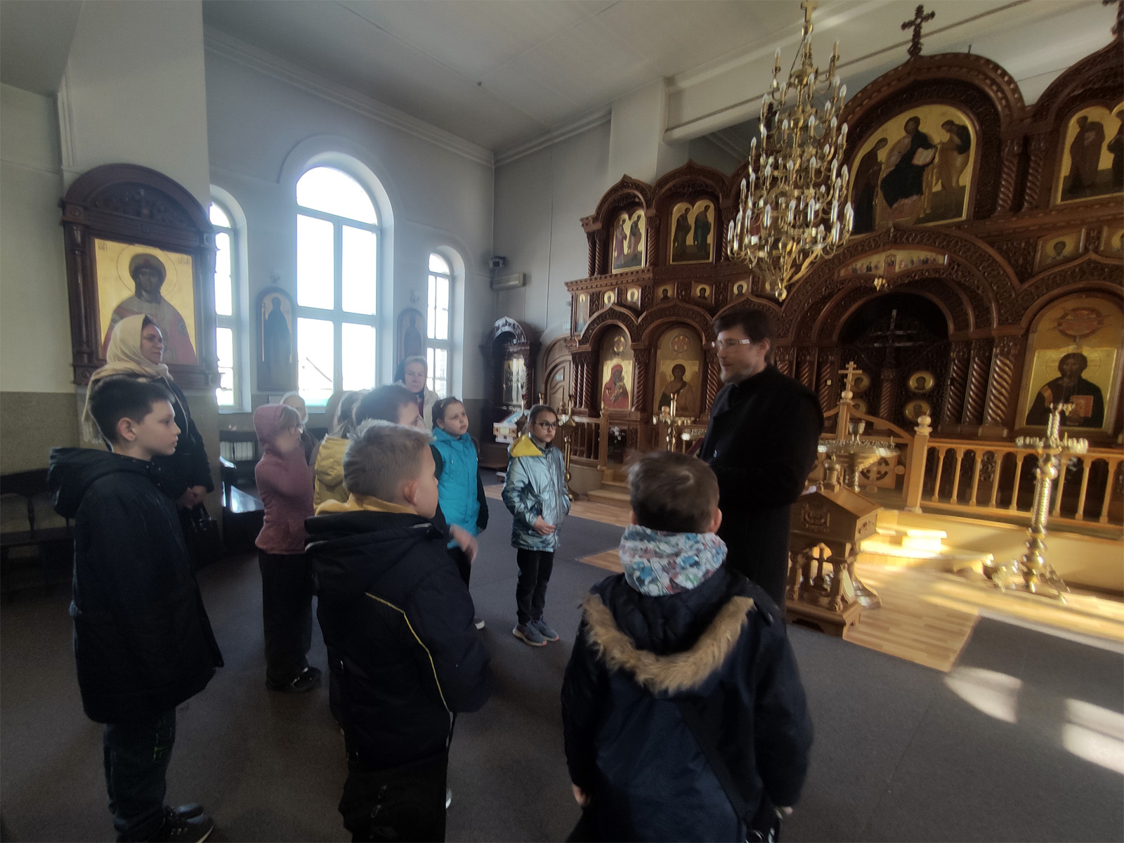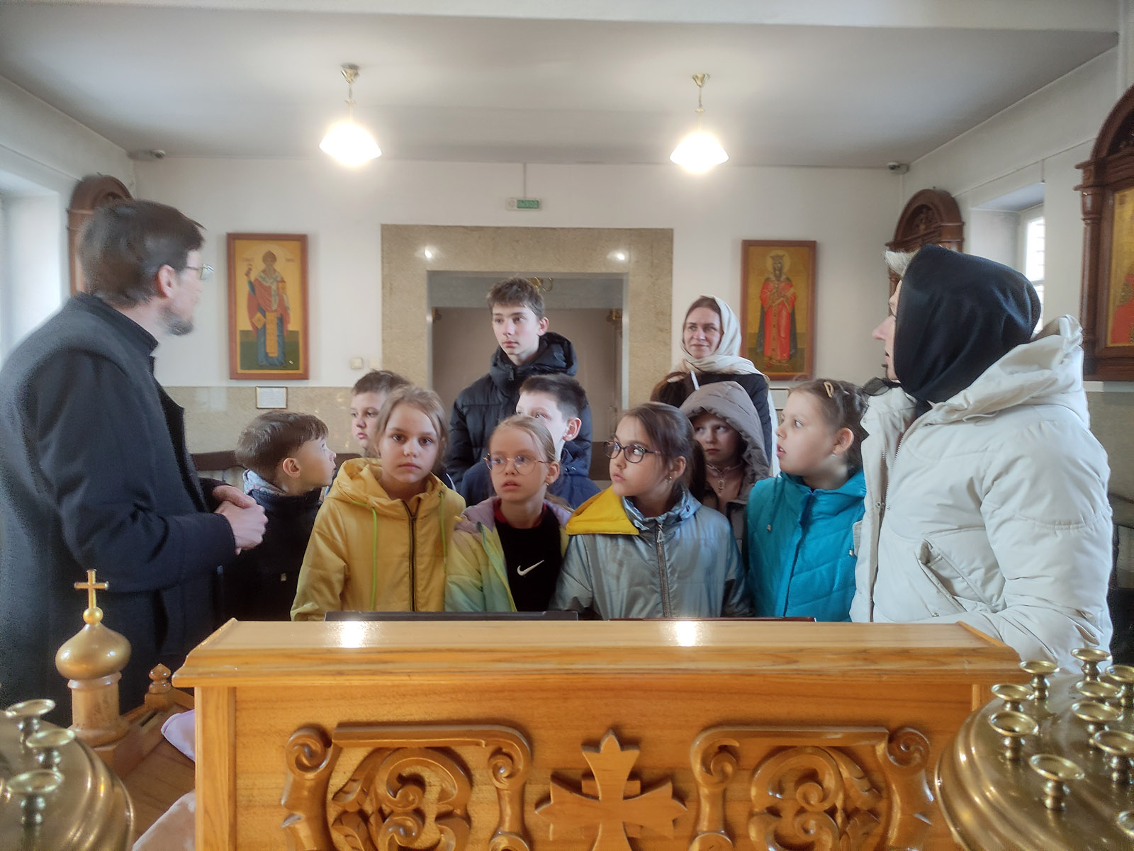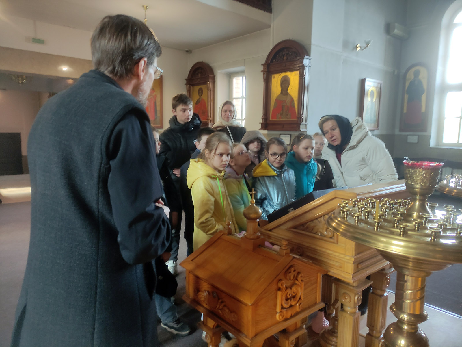 Протодиакон Михаил Сидоров провел экскурсию по храму, объяснил устройство икон, суть исповеди и причащения.