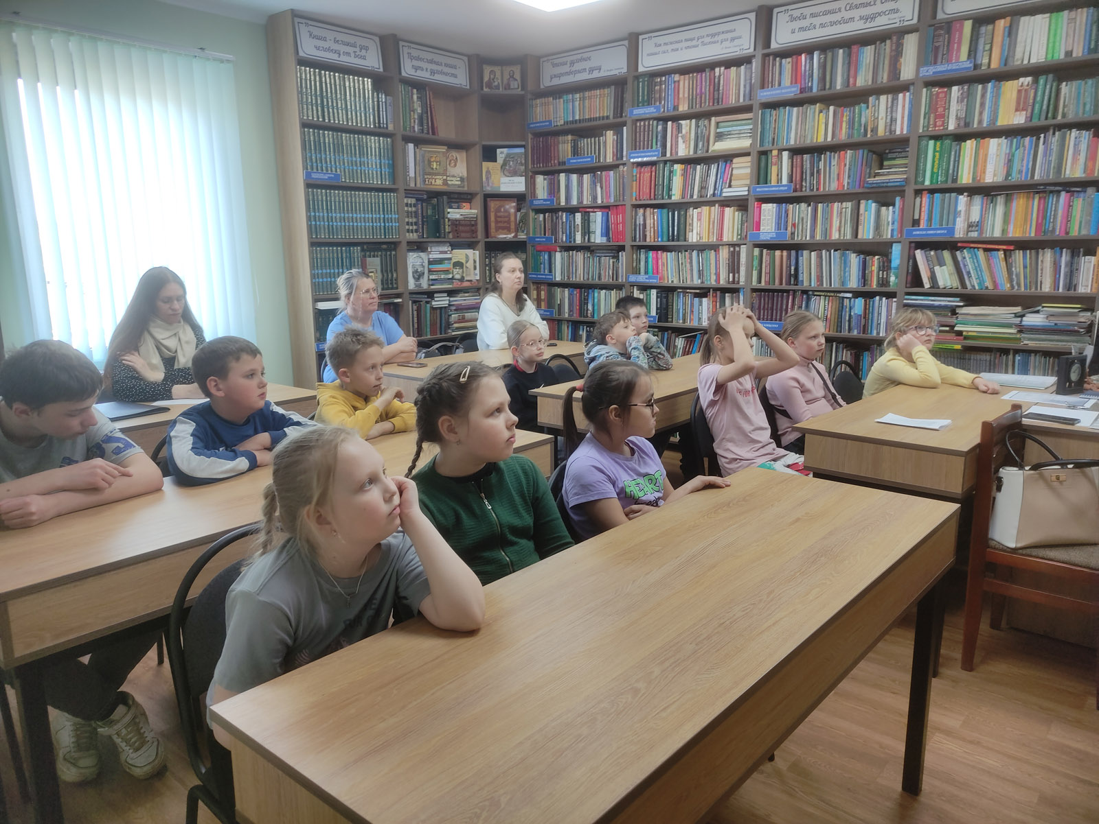 Педагог Людмила Тишкевич из Борисовского центра экологии и туризма провела беседу о значении храмов, таинствах, почитании Богородицы и Господа Иисуса Христа. Дети посмотрели мультфильм «Птичка» о Благовещении и ознакомились с православными книгами, включая старинные Евангелия и Библии.