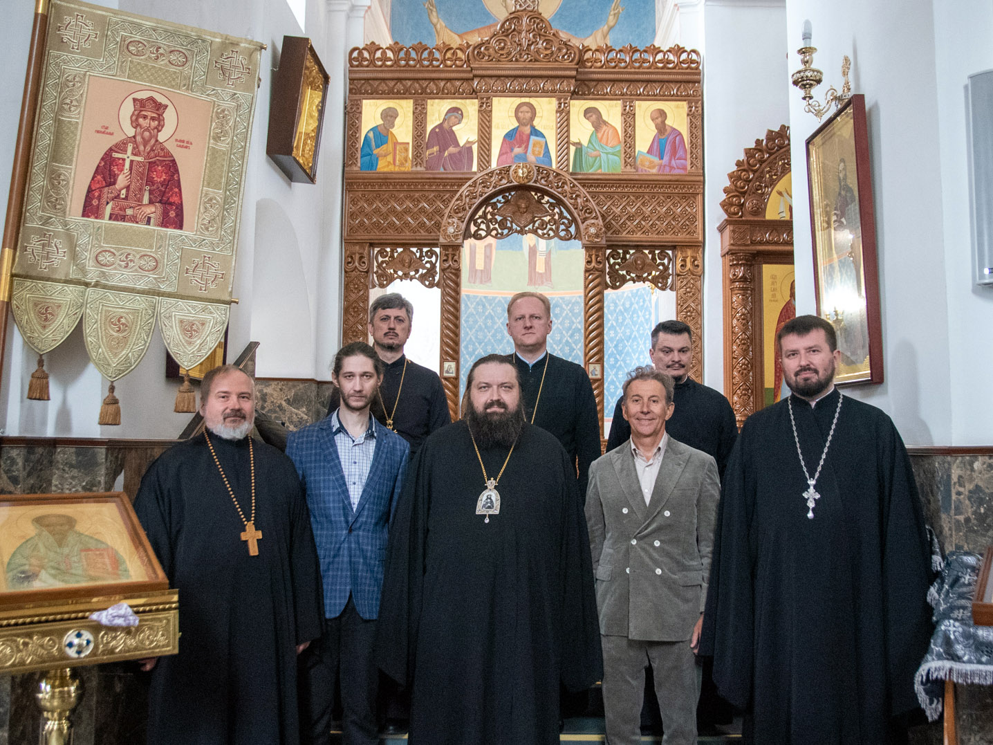 Руководитель мастерской “Завет” Юрий Юрин ознакомил собравшихся с ходом проводимых работ, рассказал о стилистике и иконографической программе проекта, который разрабатывался в течение двух лет специально для кафедрального собора и является уникальным.
