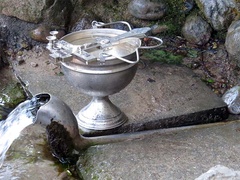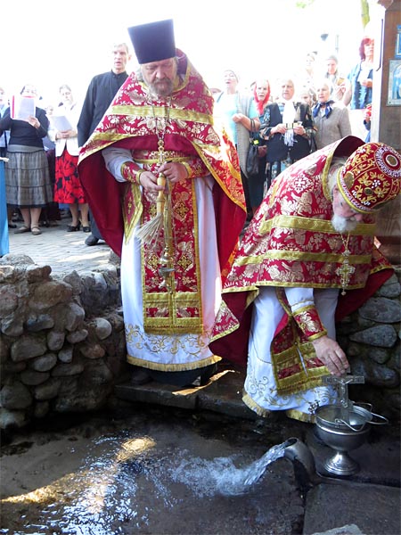 Причастившись, крестным ходом идём к источнику Николая Чудотворца, где о.Владимир и о.Александр Зимницкие совершают водосвятный молебен, после чего, окропив нас водой, все спешат набрать воду и окунуться в Никольской купели. Затем нас любезно пригласили к трапезе, где попив чая с бутербродами, печеньем и конфетами, с благодарностью мы трогаемся в обратный путь.