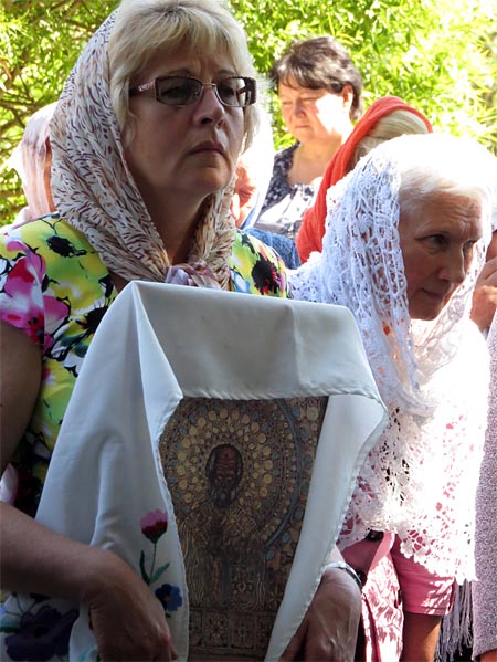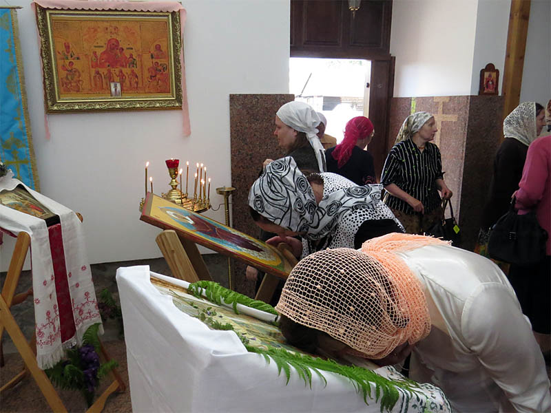 На обратном пути, в д.Зембин, нас встречает о.Андрей. Купив свечи в церковной лавке, подав записки, спешим на освящение иконы Божьей Матери «Спорительница хлебов». Эту икону нарисовала по благословению и подарила в дар храму Архистратига Михаила прихожанка храма Дмитрия Донского из Печей.