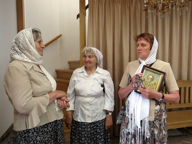 Отслужив возле иконы Николая Чудотворца молебен,нас помазали елеем освященным на мощах Николая Чудотворца из Италии. Затем, рассказав об истории храма и показав находки при реконструкции и ремонте его, мы идём фотографироваться на память на фоне церкви Архистратига Михаила с о.Андреем.