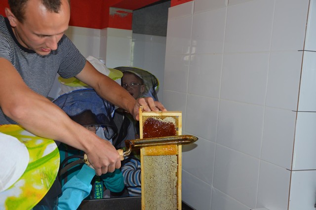 Мы узнали очень много интересного: например, что пчелы бывают агрессивными и «добрыми», что рабочая пчела живет всего 40 дней и за сезон дает пол-чайной ложечки меда. Увидели, как рождаются пчелки, как они носят нектар на своих лапках. Видели пчелиную матку, брали в руки трутней (они не кусаются). Нам рассказали и показали, как устроены улья, как откачивают мед.