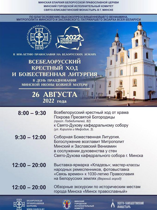 26 августа, в День обретения Минской иконы Божией Матери, в городе Минске пройдут торжества, приуроченные к празднованию 1030-летия Православия на белорусских землях и Году исторической памяти.
