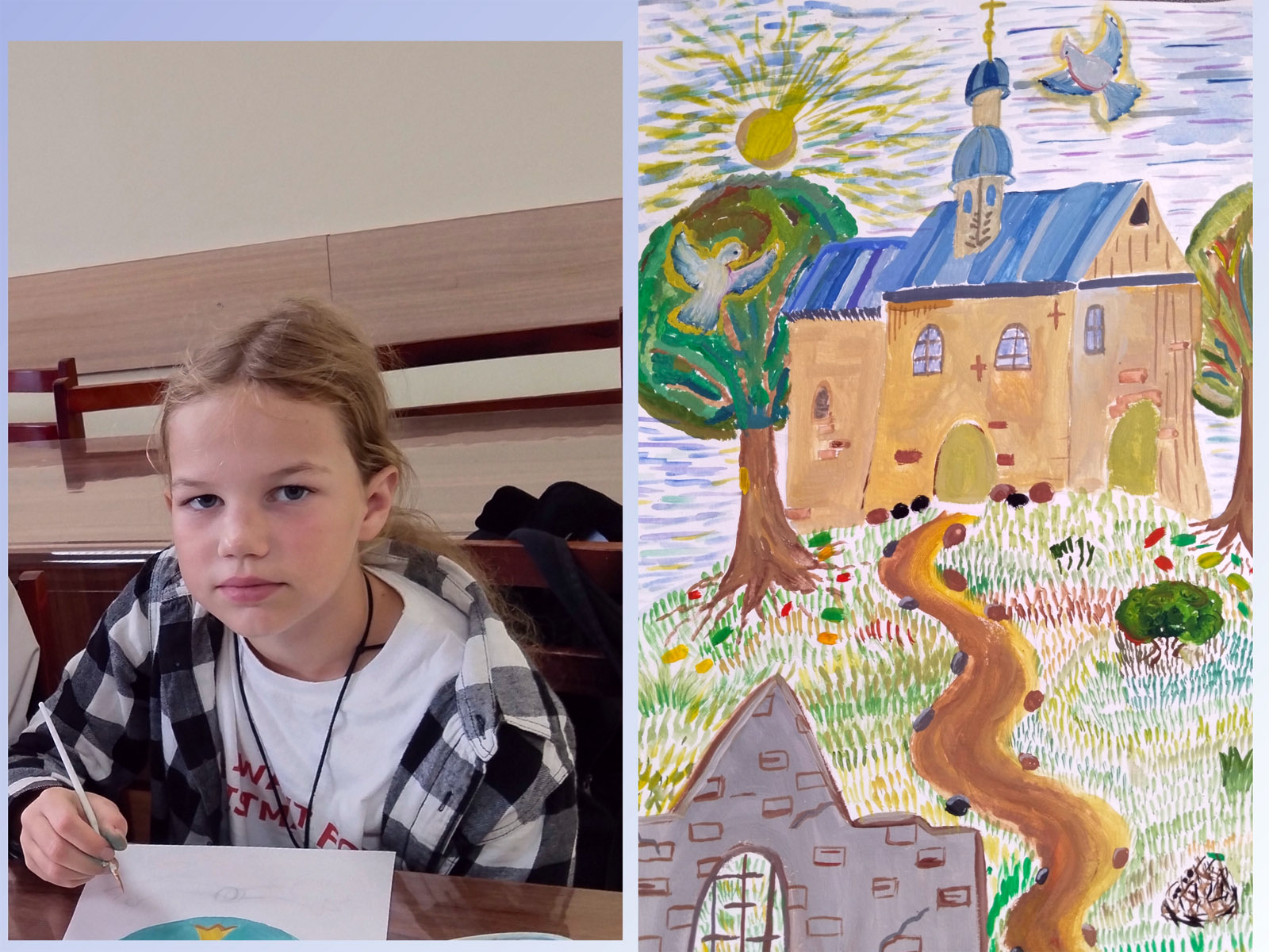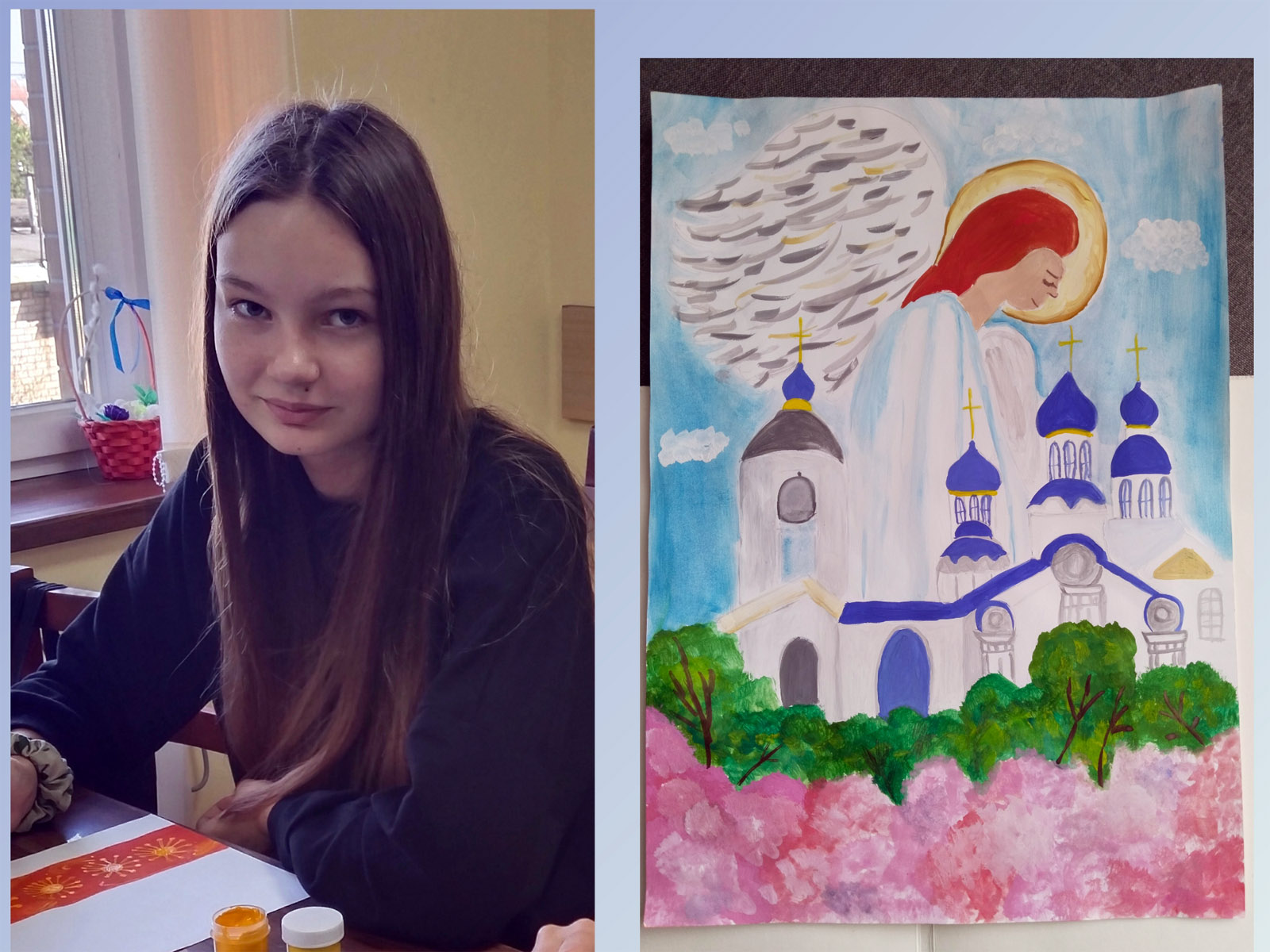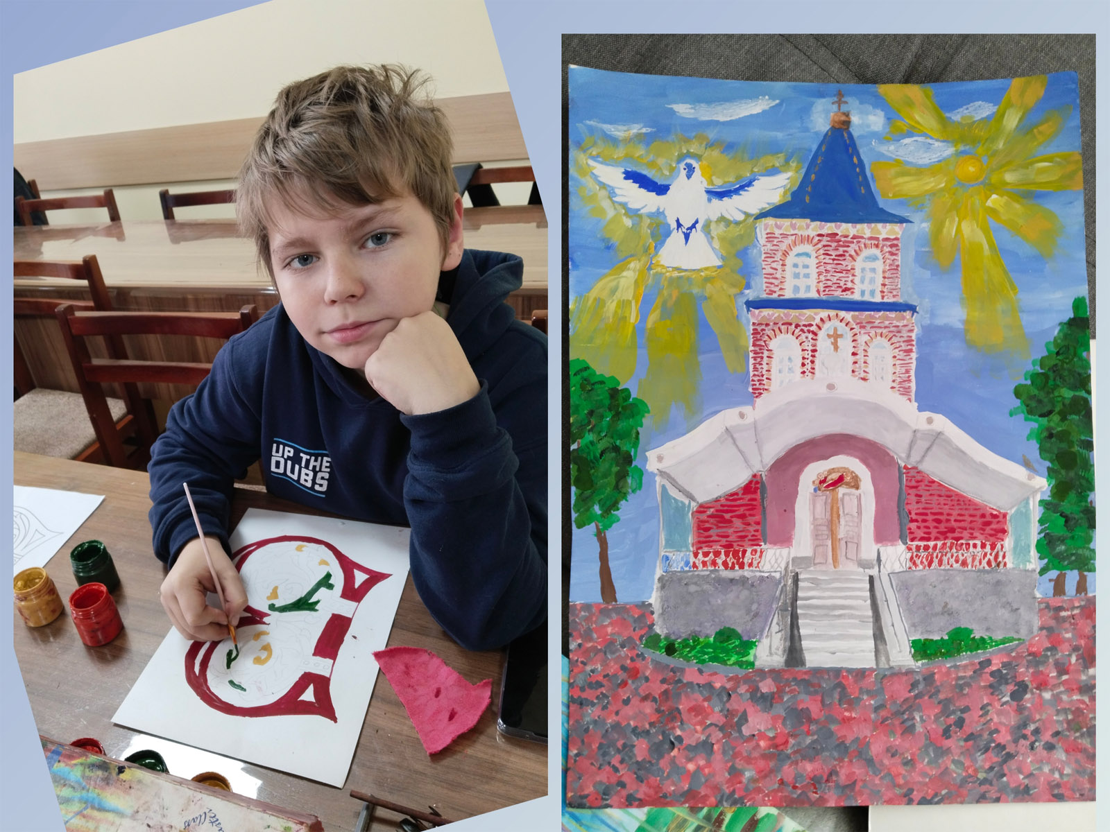 Данный конкурс проводится на протяжении многих лет и самое активное участие в нем принимают наши ребята. В этом году по Положению конкурса на суд жюри можно было представить только три работы. Хотя желающих поучаствовать было намного больше. Поэтому нам пришлось провести небольшой конкурс среди наших воспитанников. В результате на региональный этап конкурса были представлены работы Ефимовой Алисы, Трипутень Яны и Липченко Владимира. Ребята, посещают нашу школу не первый год, очень любят рисовать, заниматься творчеством. Владимир в этом году поступил ещё и в художественную школу. Алиса также учиться в художественной школе. Ребята творчески отнеслись к поставленной задаче. Очень ярко и красочно Владимир нарисовал наш любимый храм Рождества Христова. Глядя на его работу, сразу узнаешь наш храм, такой светлый, добрый и любимый всеми нами. Яна воплотила свою идею ярко и красочно, в рисунке над храмом виден Ангел - хранитель, который защищает и оберегает храм. Алиса в своем видении тематики конкурса, изобразила дорогу, ведущую в храм, удилила внимание деталям, передающим историю и современность.