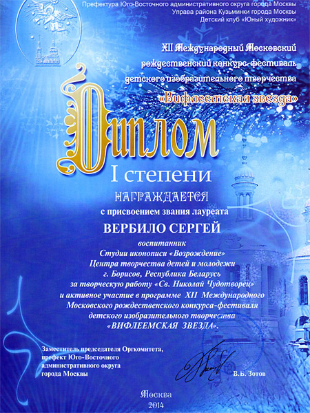 Детская студия иконописи при мастерской «Взор» Свято-Воскресенского кафедрального собора г.Борисова приняла участие в XII Международном Московском Рождественском конкурсе-фестивале «Вифлеемская звезда».