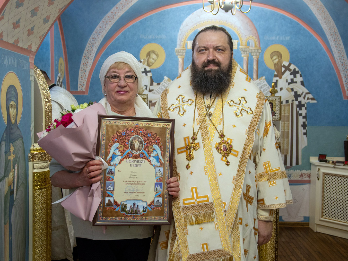 Затем архипастырь поздравил сотрудницу собора Галину Геннадьевну Чолпан с юбилейной датой дня рождения. За её многолетние ревностные труды на благо собора ей была вручена архиерейская грамота.Также Владыка сердечно поздравил всех тезоимённых с праздником святой Татьяны Римской. Хор провозгласил многолетие новоиспечённой юбилярше и всем Татьянам, вознося молитвы о здравии и долголетии.