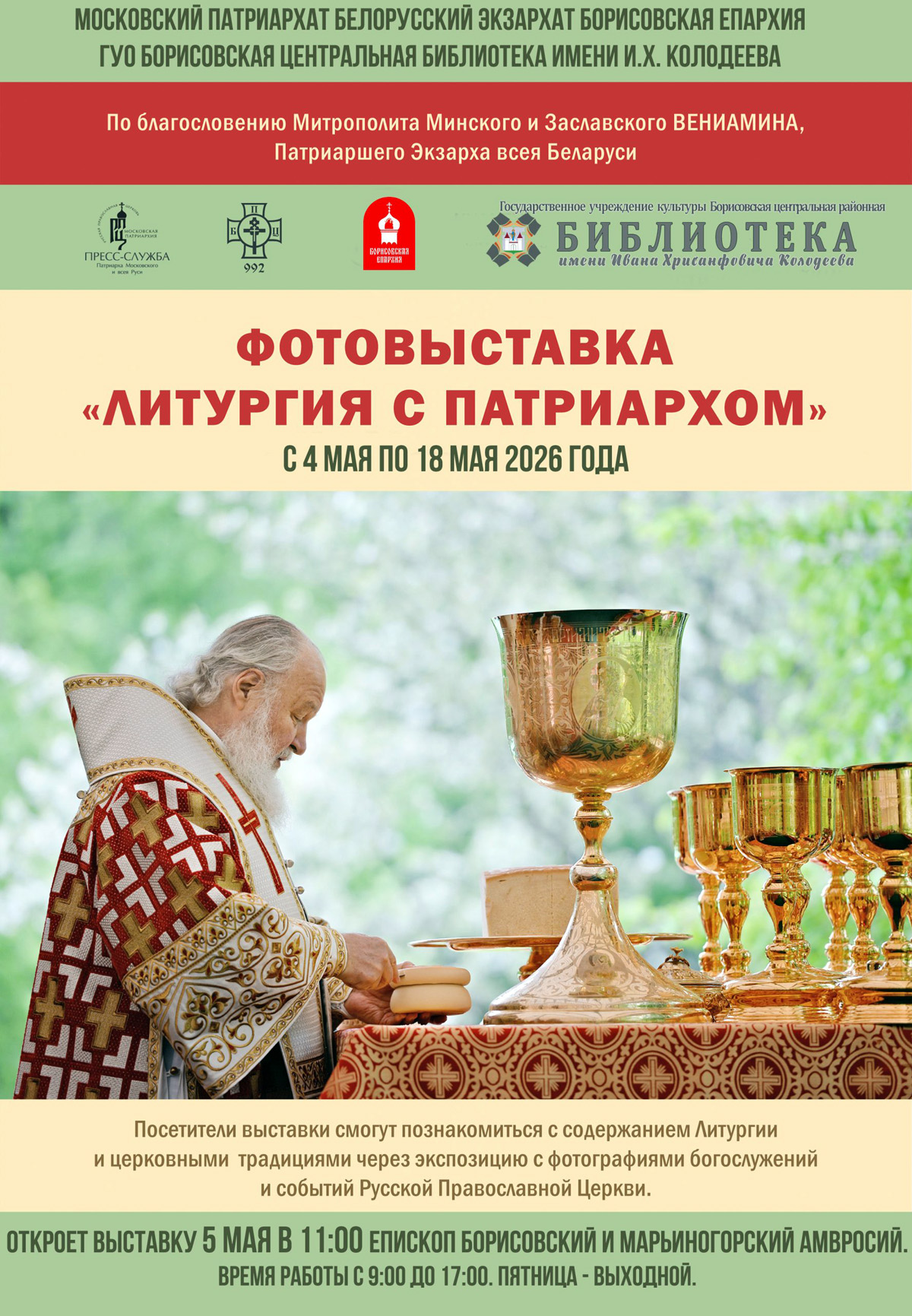 5 мая в 11:00 в ГУО «Борисовская центральная библиотека имени И.Х. Колодеева» епископ Борисовский и Марьиногорский Амвросий возглавит торжественное открытие фотовыставки «Литургия с Патриархом».