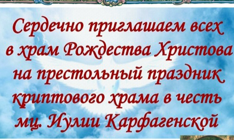 Сердечно приглашаем всех в храм Рождества Христова на престольный праздник криптового храма в честь мученицы Иулии Карфагенской.