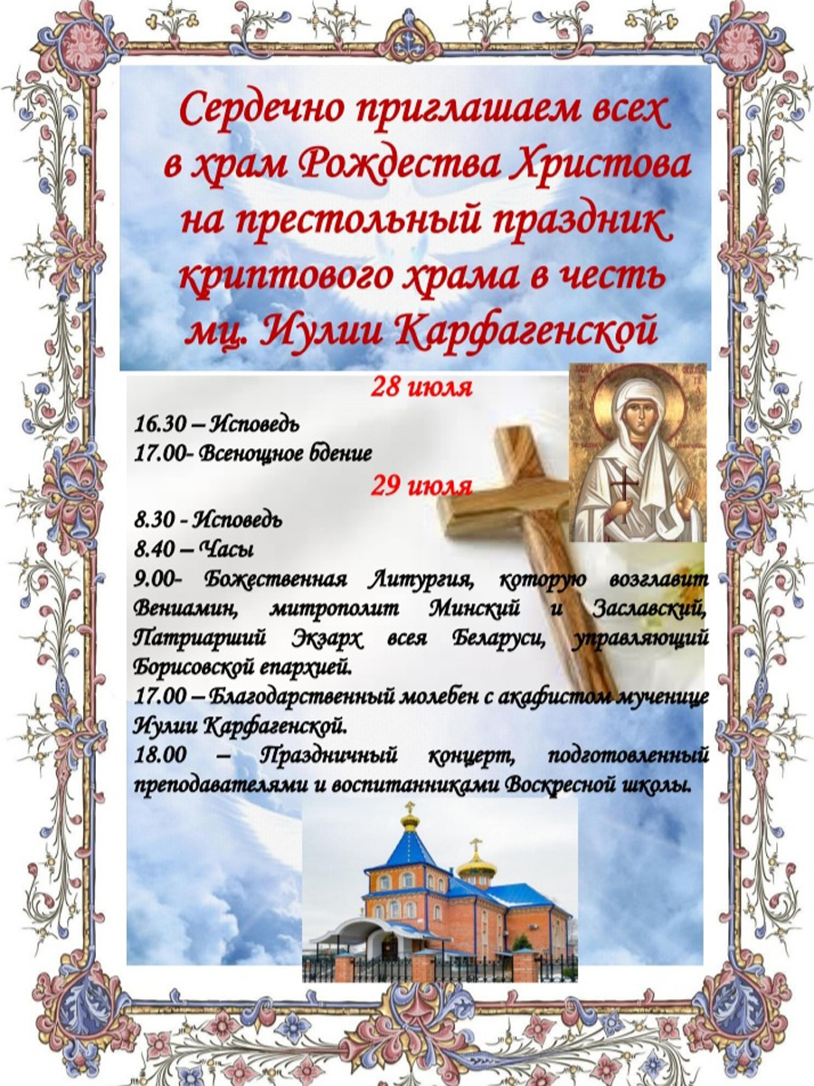 29 июля 8:30 - исповедь, 8:40 - часы. 9:00 - Божественная Литургия, которую возглавит митрополит Минский и Заславский Вениамин, Патриарший Экзарх всея Беларуси, управляющий Борисовской епархией. 17:00 - благодарственный молебен с акафистом мученице Иулии Карфагенской. 18:00 - Праздничный концерт, подготовленный преподавателями и воспитанниками Воскресной школы.