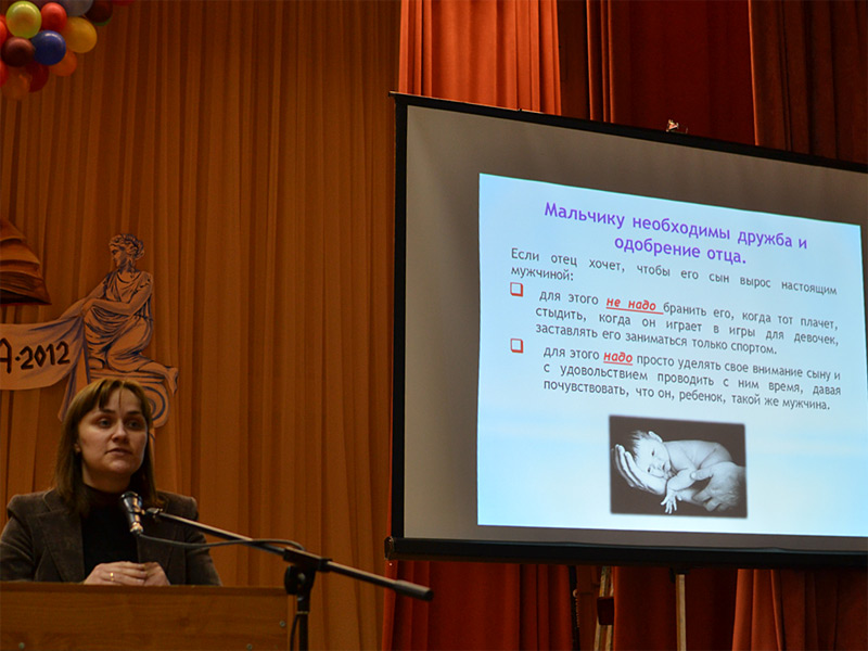 На него были приглашены не только отцы, но и их дети. Здесь поднимались серьезные вопросы воспитания подростка в семье, и роли родителей, прежде всего отцов в этом процессе. В выступлениях педагогов-психологов школы М.Н.Сорокун, О.В.Драницы говорилось о психологических особенностях подростков, которые в значительной степени определяют их поведение. Миссия же отца — передать ребенку свой жизненный опыт, своё мировоззрение, не ограничивая, а расширяя сознание и свободу своих детей.