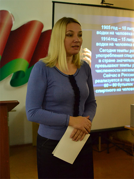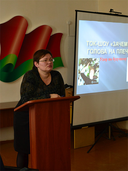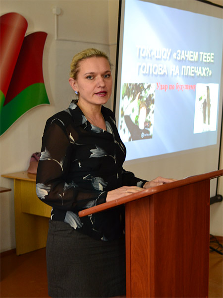 Вела ток-шоу заместитель директора по воспитательной и идеологической работе Лариса Анатольевна Сёмушкина. О вреде алкоголя, влияния его на здоровье, психику подростков выступили преподаватели гимназии, педагог-психолог, врач-нарколог Борисовского психоневрологического диспансера. Свое мнение высказывали и сами учащиеся.