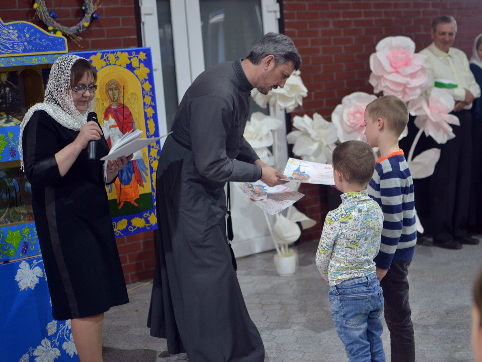 Всех собравшихся на концерт приветствовал и поздравил с Пасхой и днем святых жен-мироносиц секретарь Борисовской епархии, благочинный 1-го Борисовского церковного округа, настоятель прихода храма Рождества Христова протоиерей Александр Вербило. Наиболее активным участникам концерта и его организаторам отец Александр вручил дипломы.