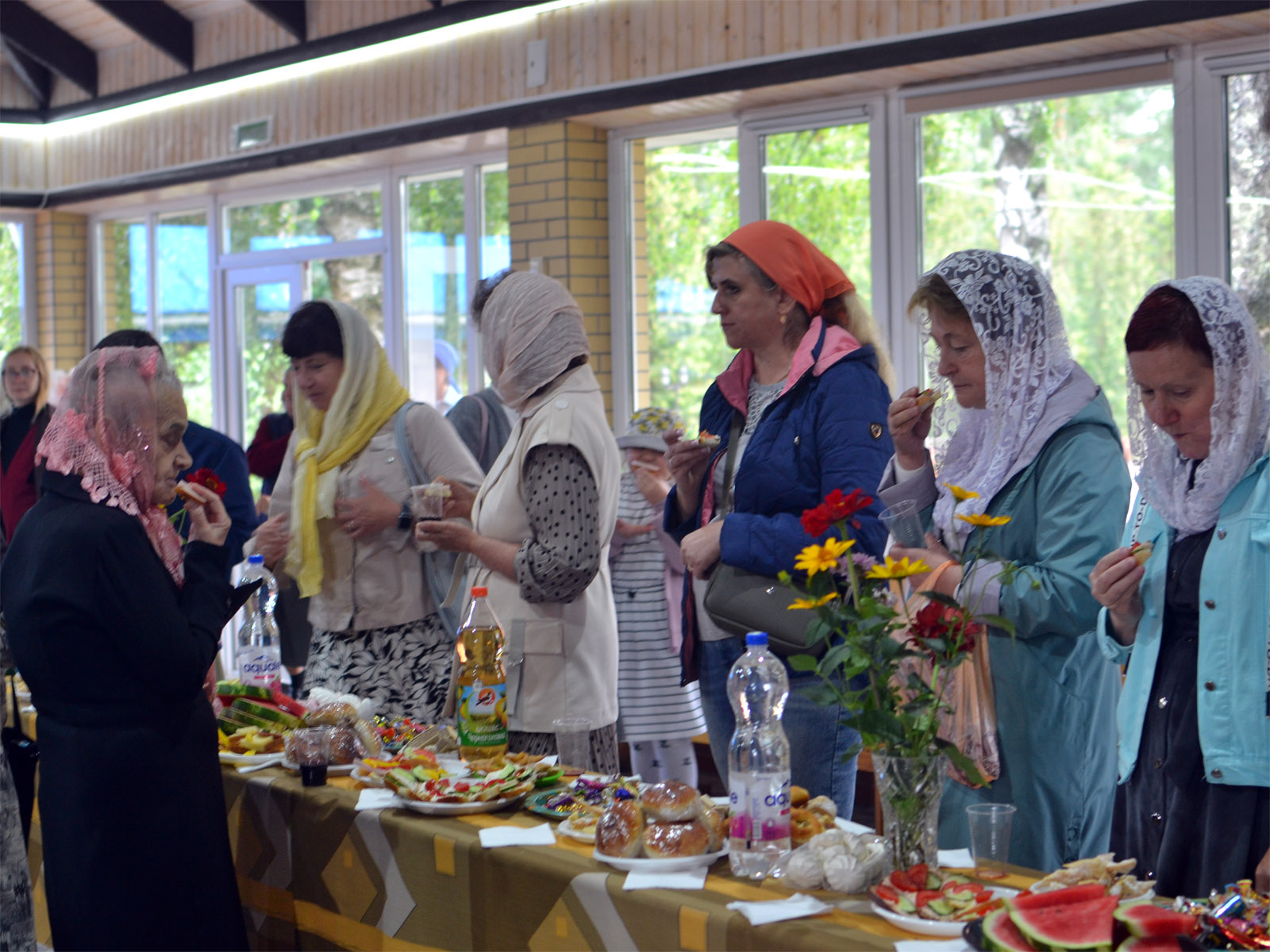 Чаепитие было организовано с участием прихожан, которые в домашних условиях готовили выпечку для чая, приносили из дома другие сладости, овощи и фрукты, а также многое было закуплено и непосредственно приходом. Подготовка праздничного стола, организация чаепития проходила под руководством казначея прихода Марии Николаевны Гудымовой