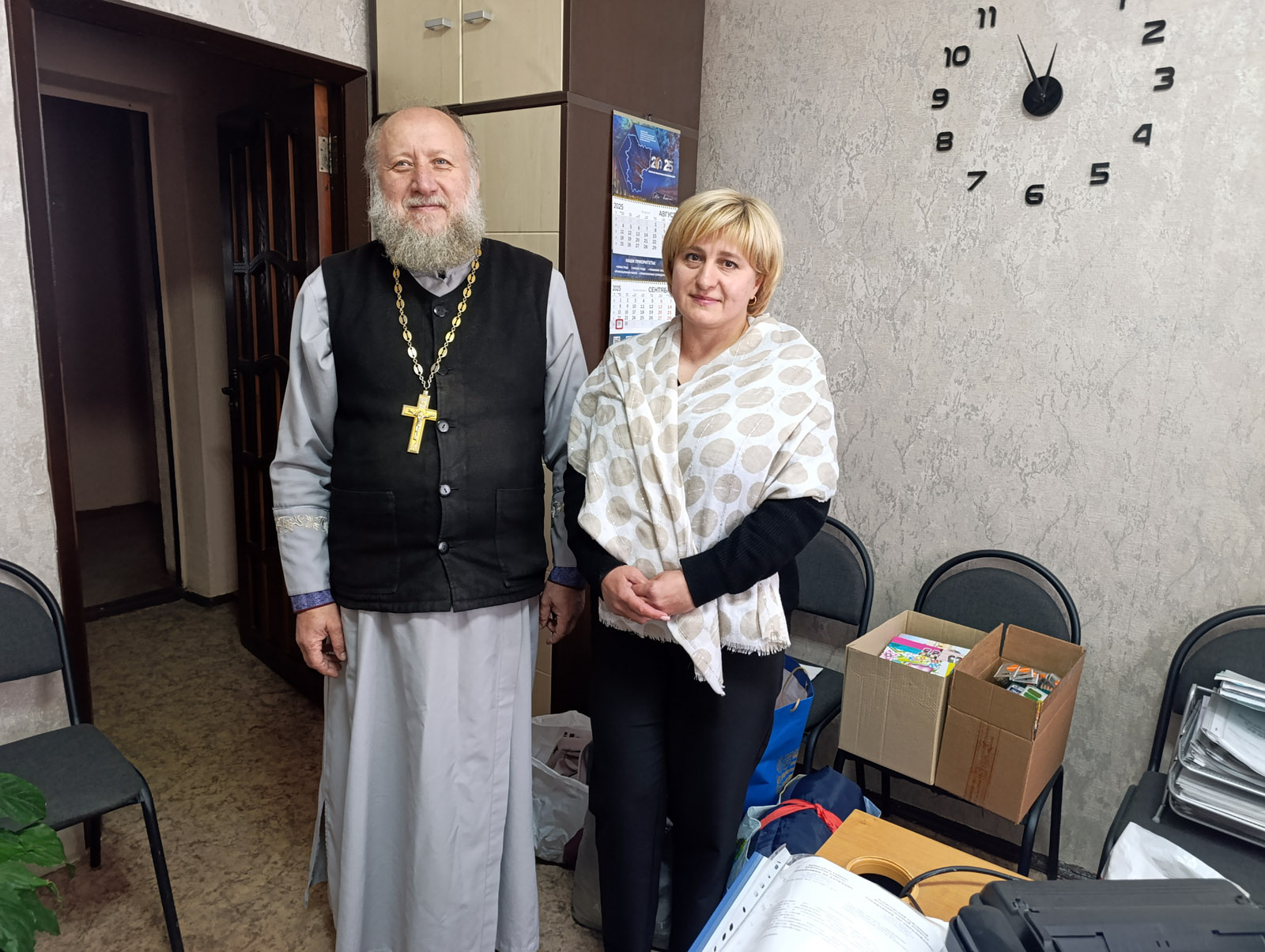 Отец Александр пообщался с заведующей учреждения Улановой Натальей Васильевной и передал для воспитанников данного социального приюта школьно-письменные принадлежности, игрушки, одежду.