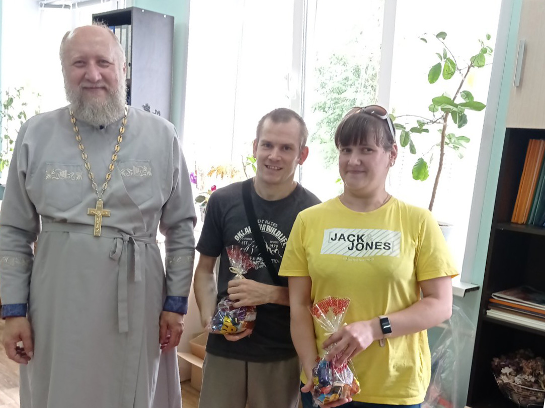Эти встречи всегда радостное событие, как для ребят, так и для батюшки. Очень эмоционально рассказали ребята, как они играли в футбол, о своих победах. Тепло пообщавшись с молодыми людьми и педагогами отец Александр вручили ребятам сладкие подарки, развивающие игры, конструкторы, а заведующая дневным отделением Корнюшко Марина Николаевна подарила сувенир сделанный ребятами своими руками, под руководством педагогов.
