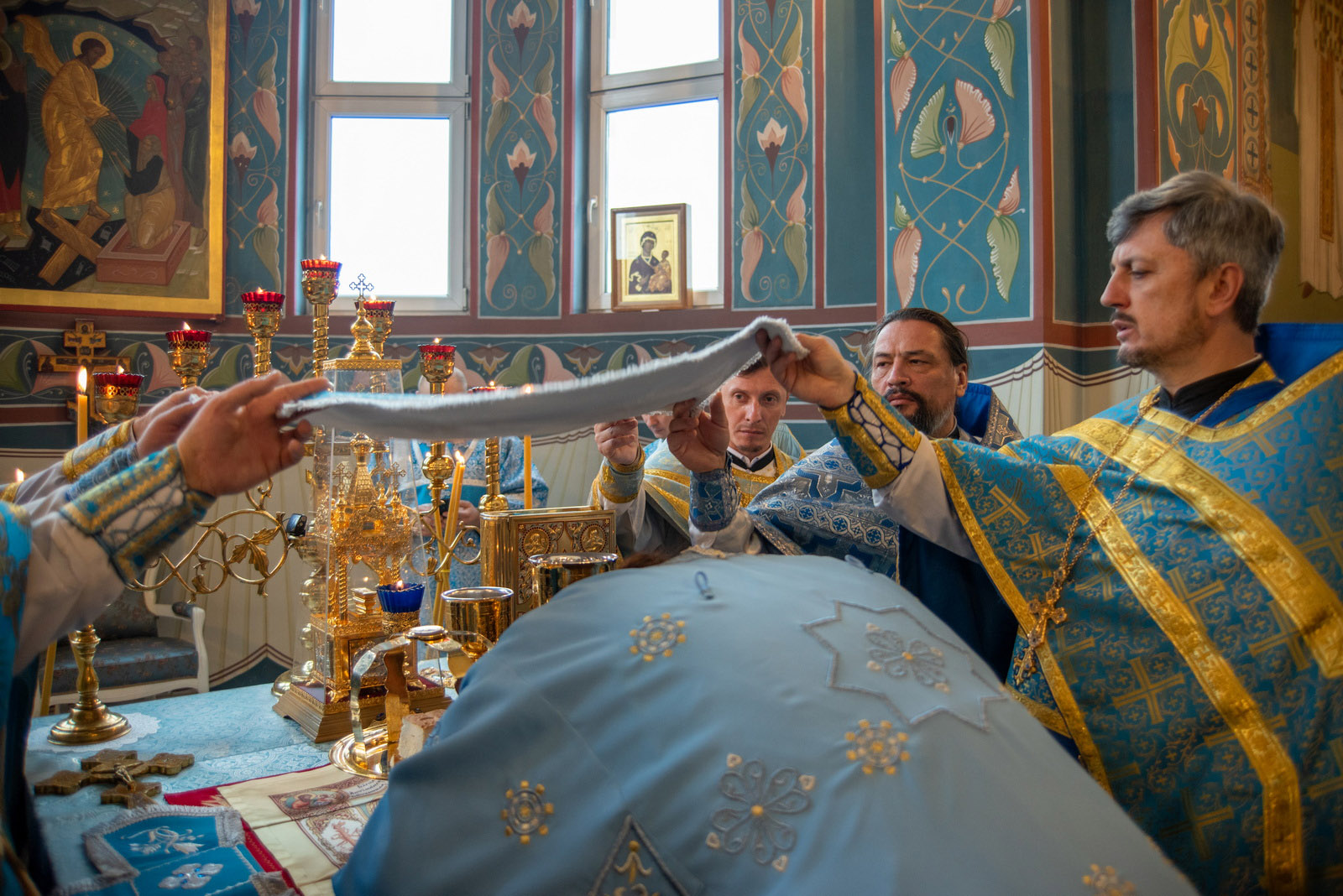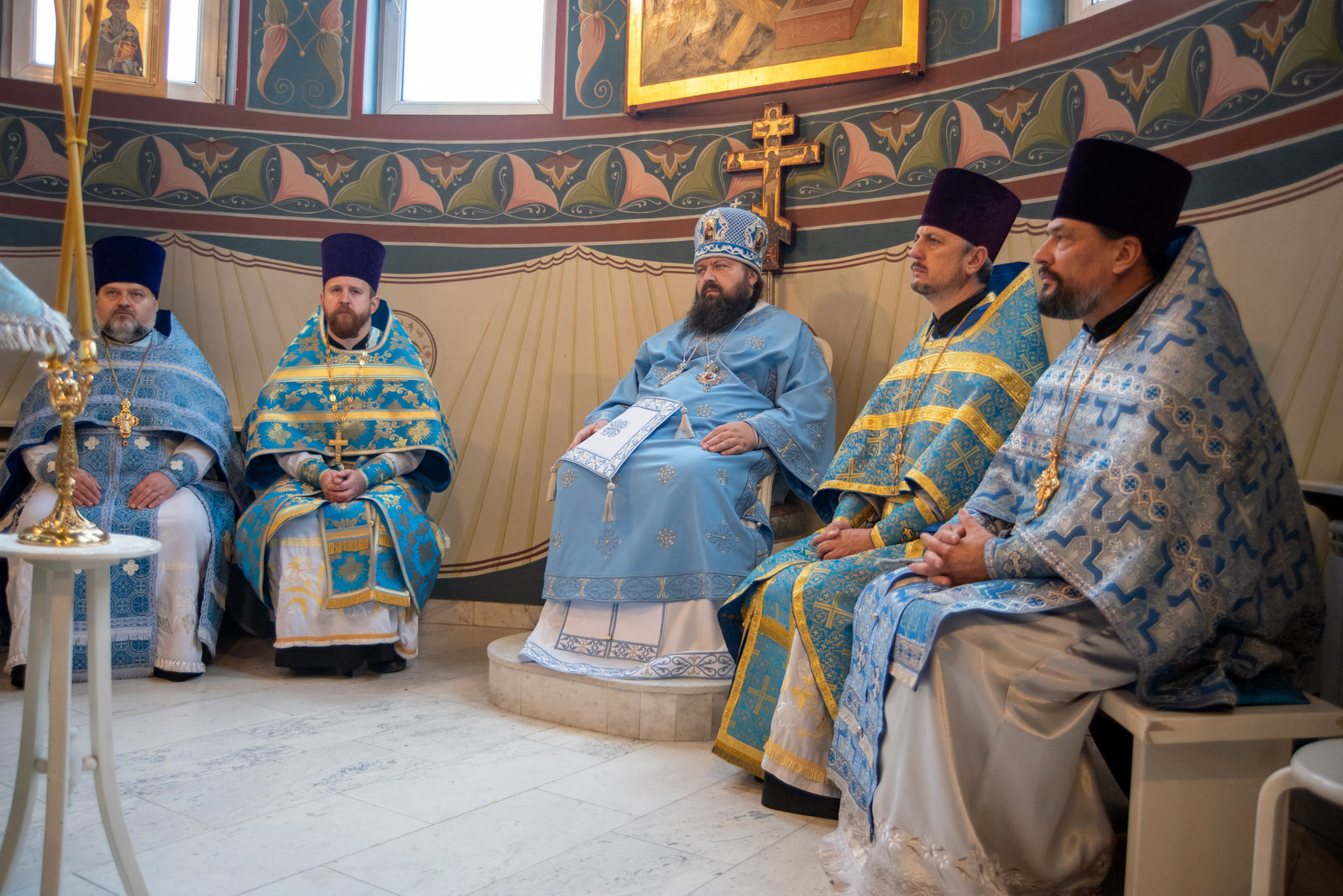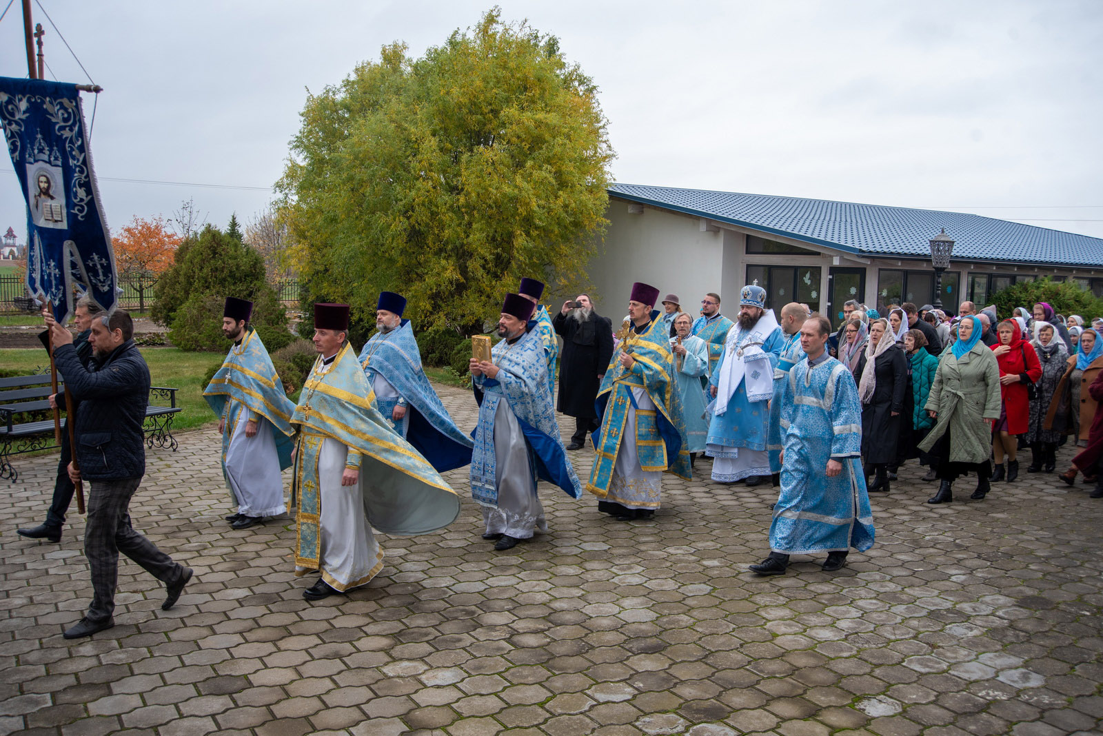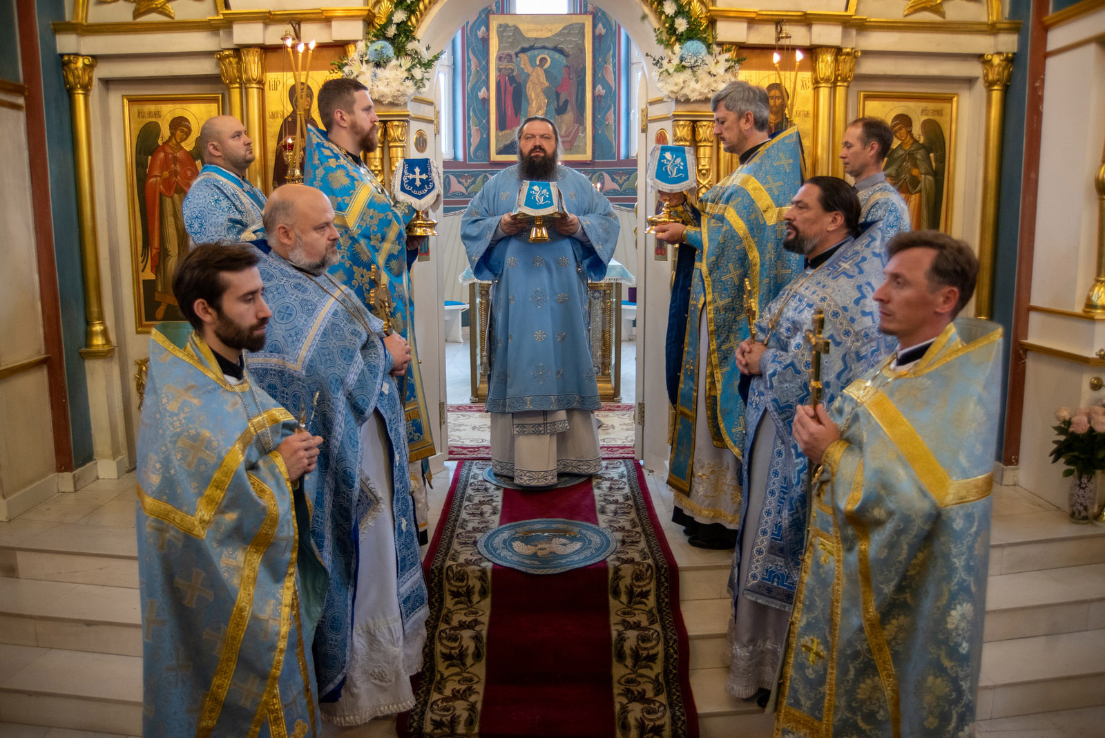 По окончании богослужения владыка Амвросий и сослужащие священнослужители совершили крестный ход. Затем владыка Амвросий освятил новосозданную ризу для храмовой иконы Божией Матери и вместе с сослужащим духовенством совершил славление Богородице, после чего обратился к собравшимся со словом назидания.