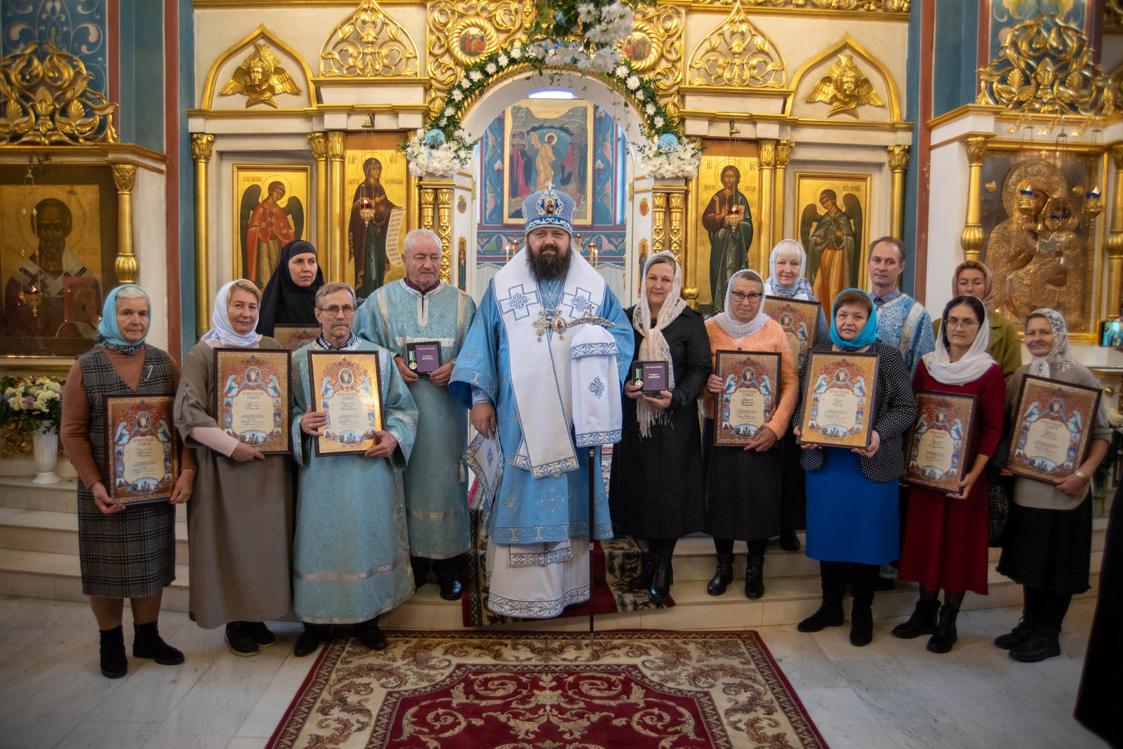 Далее архипастырь удостоил медалей Марьиногорской иконы Божией Матери II степени Тютюнникову Инну Владимировну и Булыгу Бориса Степановича. Также владыка удостоил архиерейских грамот особо потрудившихся в развитии прихода.